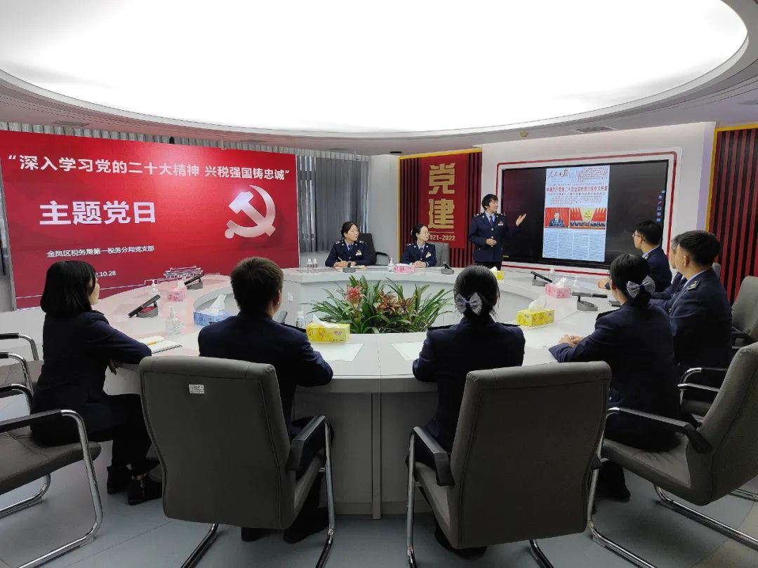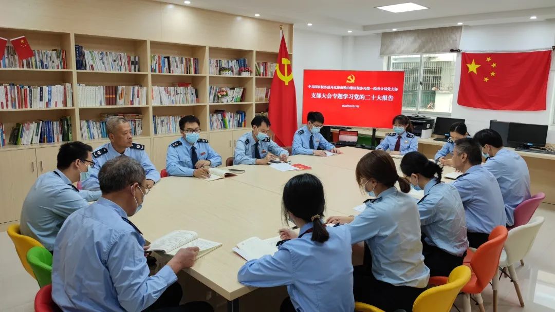 在广西,北海市铁山港区税务局党支部专题学习党的二十大精神,深刻领悟二十大报告的丰富内涵,并畅谈心得体会。