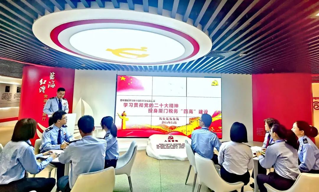 在厦门,同安区税务局青年理论学习小组集体学习党的二十大精神。青年干部们表示,要把二十大精神贯彻落实到实际工作中,落实好各项税费政策。