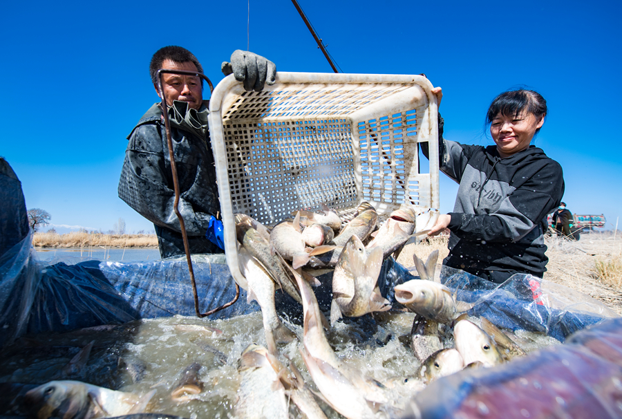 “一二三、一二三……”“起鱼咯!”近期,位于吉木萨尔县北庭镇的兆祥养殖专业合作社迎来丰收,工人们分工明确,合力收网、分拣装筐,鱼跃人欢笑。