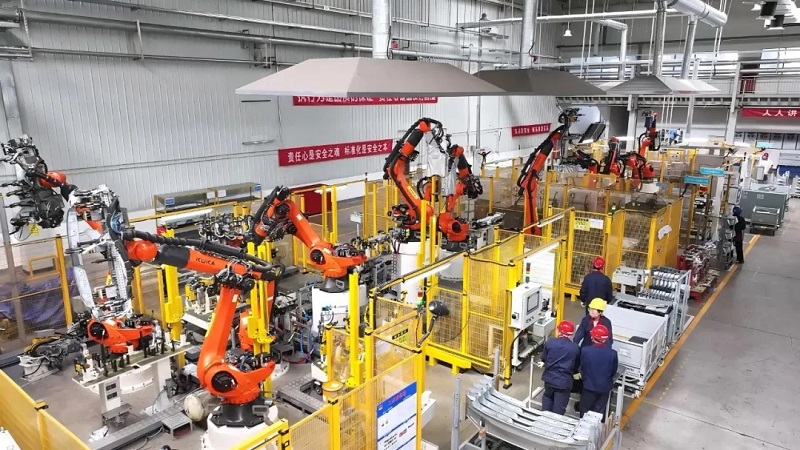 来金(天津)汽车零部件有限公司生产车间中的轿车车身总成焊接生产线。该生产线包括9台自动化焊接&搬运KUKA机器人,配置进口博士焊接控制器及自动化涂胶系统。孙晓斌 刘鹏/摄