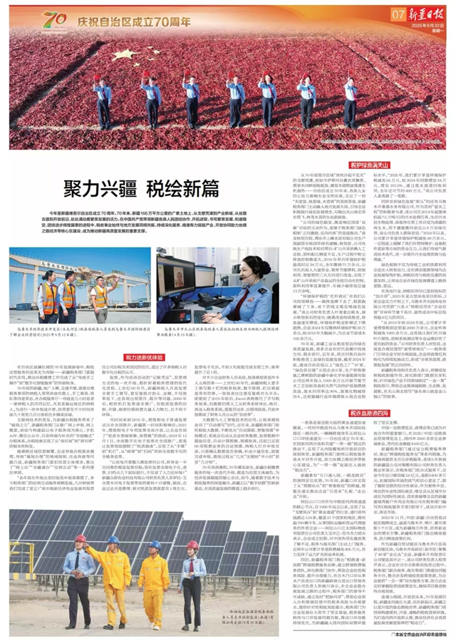 今年是新疆维吾尔自治区成立70周年。70年来,新疆166万平方公里的广袤土地上,从戈壁荒滩到产业新城,从丝路古道到开放前沿,处处涌动着繁荣发展的活力。在中国共产党带领新疆各族人民团结协作、开拓进取,书写繁荣发展、和谐稳定、团结进步辉煌篇章的进程中,税收事业始终与地方发展同频共振,持续深化服务、精准有力赋能产业、开放协同助力丝绸之路经济带核心区建设,成为推动新疆高质量发展的重要支撑。