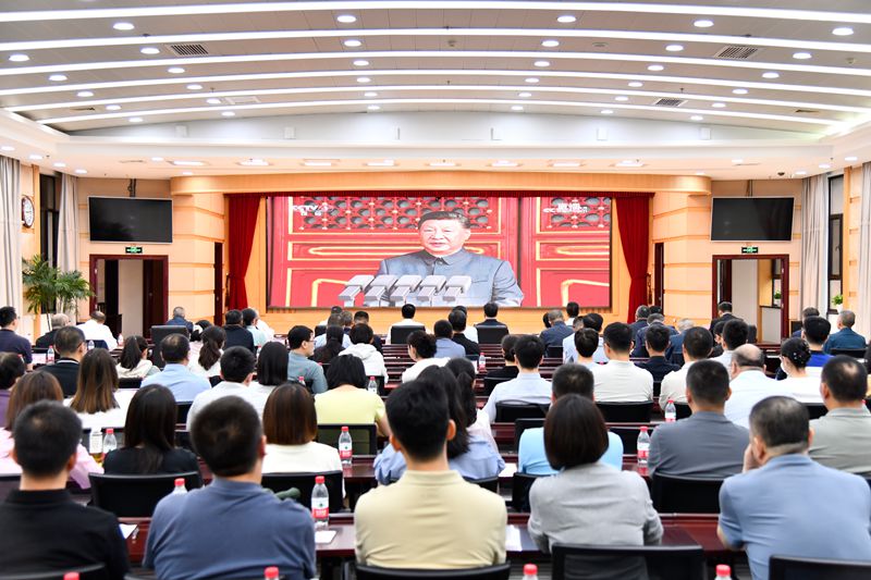 图为 新疆税务局干部职工收看纪念中国人民抗日战争暨世界反法西斯战争胜利80周年大会直播