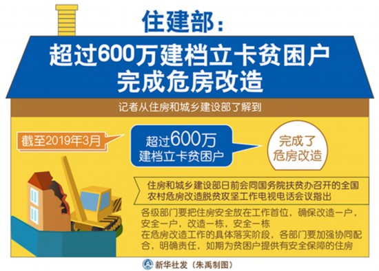 新华社北京3月7日电(薛宇航、王优玲)记者从住房和城乡建设部了解到,近年来农村危房改造工作取得了实质性进展,截至2019年3月,超过600万建档立卡贫困户完成了危房改造。