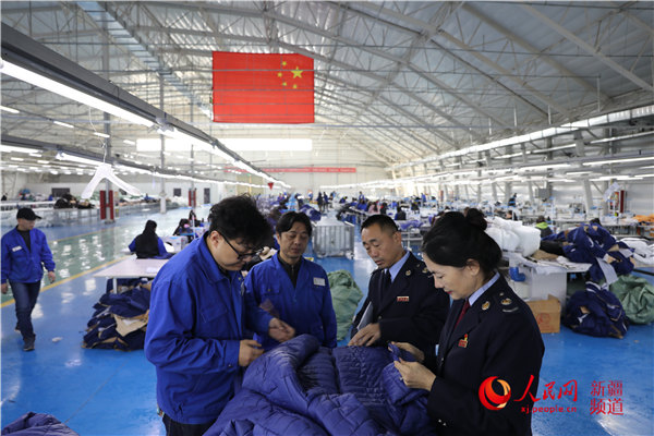 纺织车间负责人向税务人员介绍产品