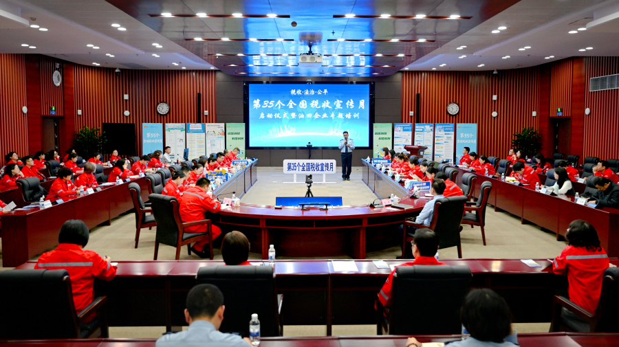 图为 克拉玛依市税务局开展第35个全国税收宣传月启动仪式暨油田企业专题培训